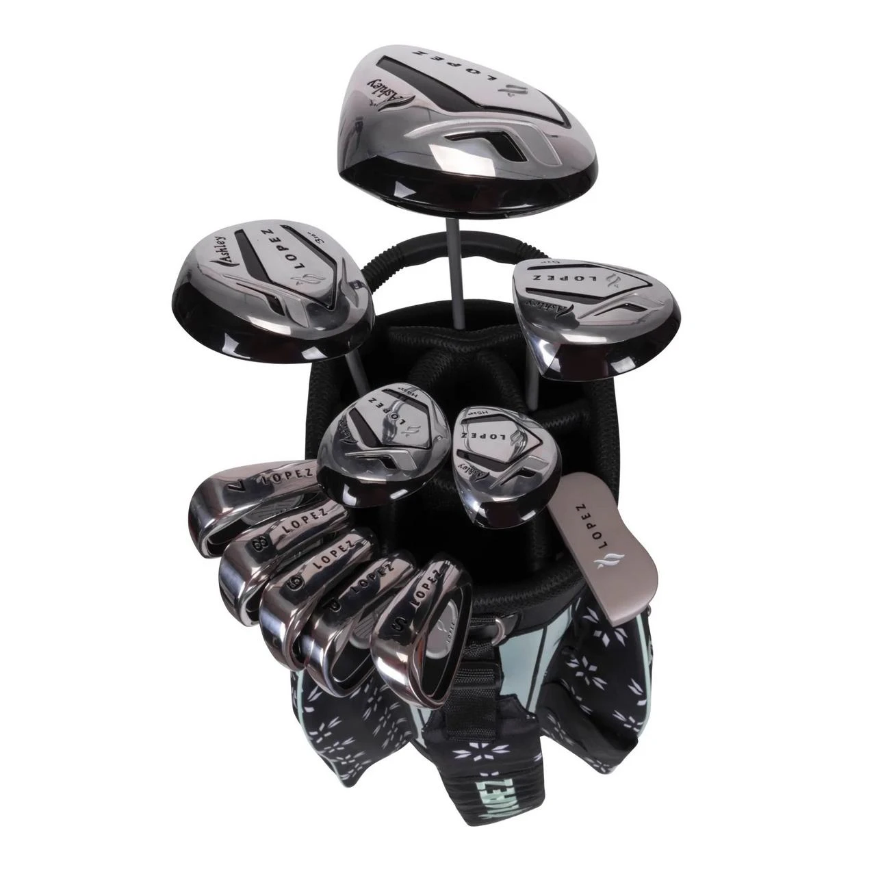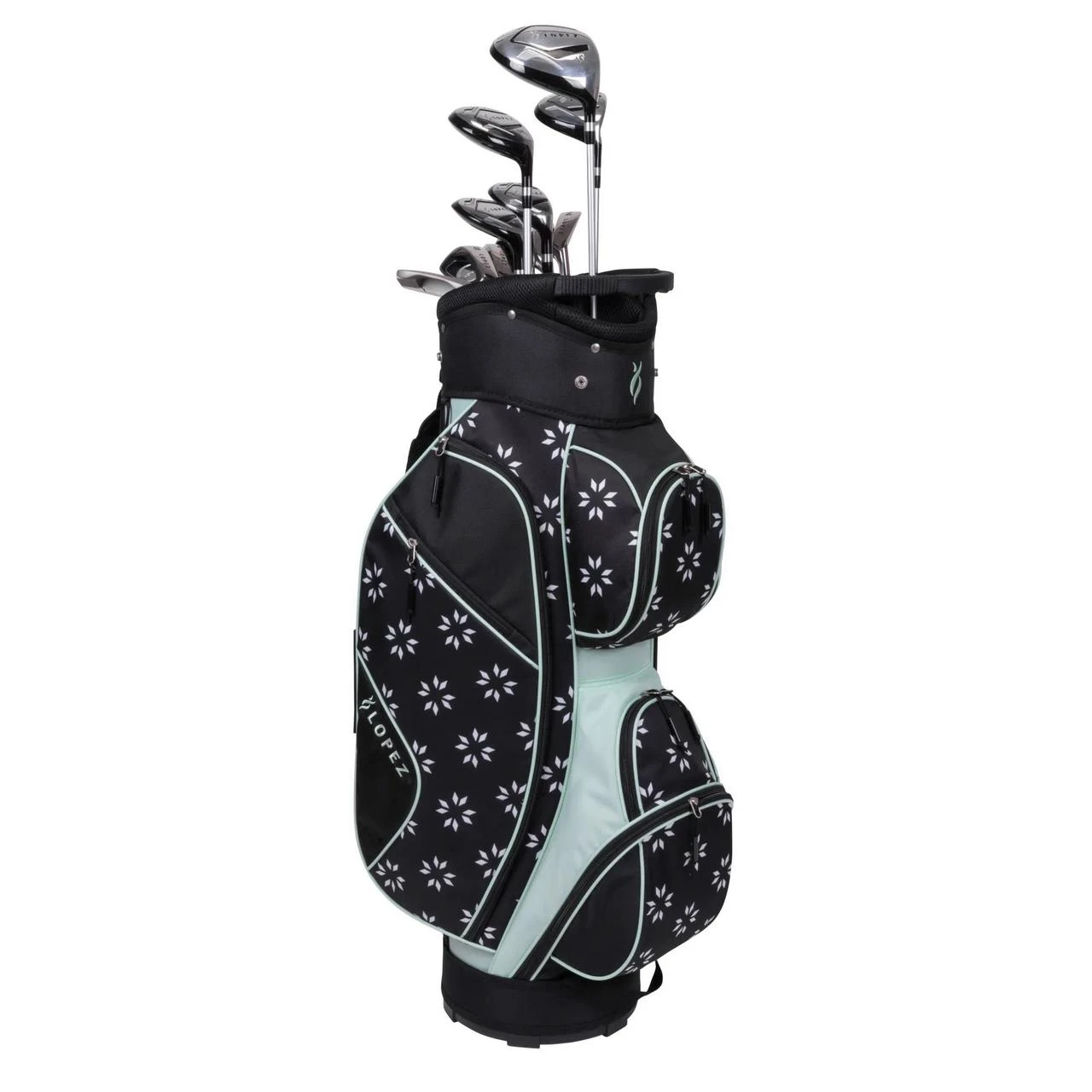 New and improved Ashley Package Set continues our tradition of manufacturing high-quality, well-balanced, easy-to-hit golf clubs that our Lopez Golf customers have come to expect. This package set includes the new Ashley 14⁰ Aluminum Driver, 3/5 Aluminum Fairway Woods, 4/5 Aluminum Hybrid Woods, 7/8/9/PW/SW Stainless Steel Irons, Zinc Putter and New Lightweight 600d Nylon fashionable cart bag and polyester/nylon headcovers. New and improved Ultra Light Graphite Shafts with soft rubber grips allow you to perform at your best. Lightweight nylon bag now features a 7-way divider at the top to protect your clubs, single padded shoulder strap, 7 zippered pockets for multiple storage, umbrella holder, nylon rain hood, towel ring, glove holder, and handles at the top and bottom of the bag.