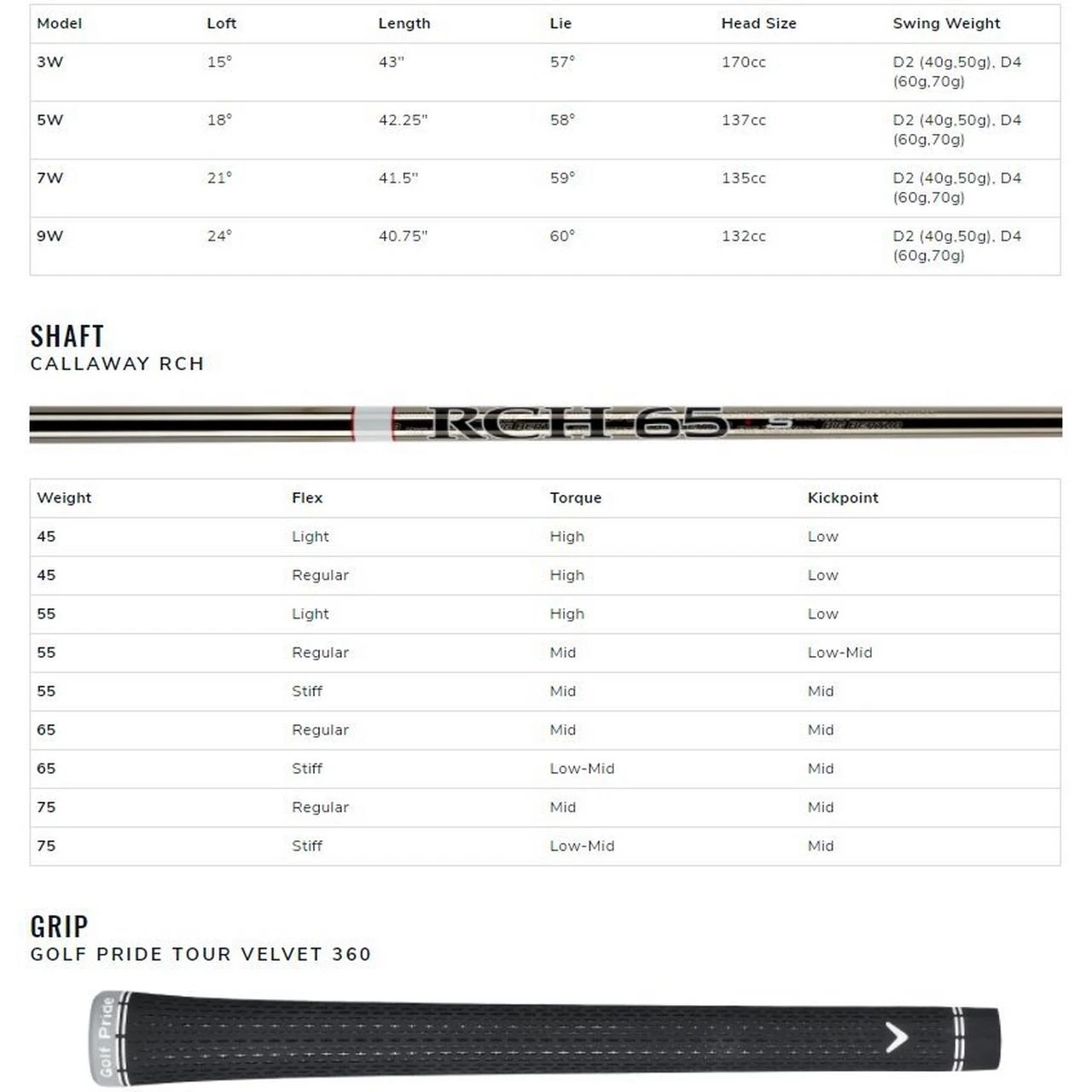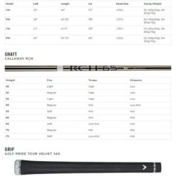 Features a completely new RCH shaft, designed by Callaway to specifically enhance the Big Bertha offering, with an Active Tip Flag section for easy launch. And it comes stock with a Golf Pride Tour Velvet Soft Grip.