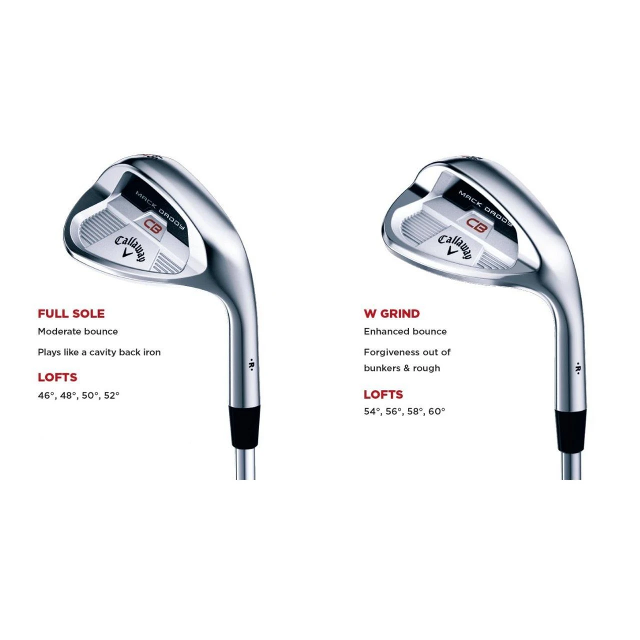The Mack Daddy CB features two sole grinds, both engineered to promote consistency. In the lower lofts, a full sole provides iron-like turf interaction with moderate bounce. In the mid and higher lofts, a modified W Grind enhances bounce to add forgiveness out of bunkers and thick rough. The modified W Grind is designed with a low leading edge if you need to open the face.