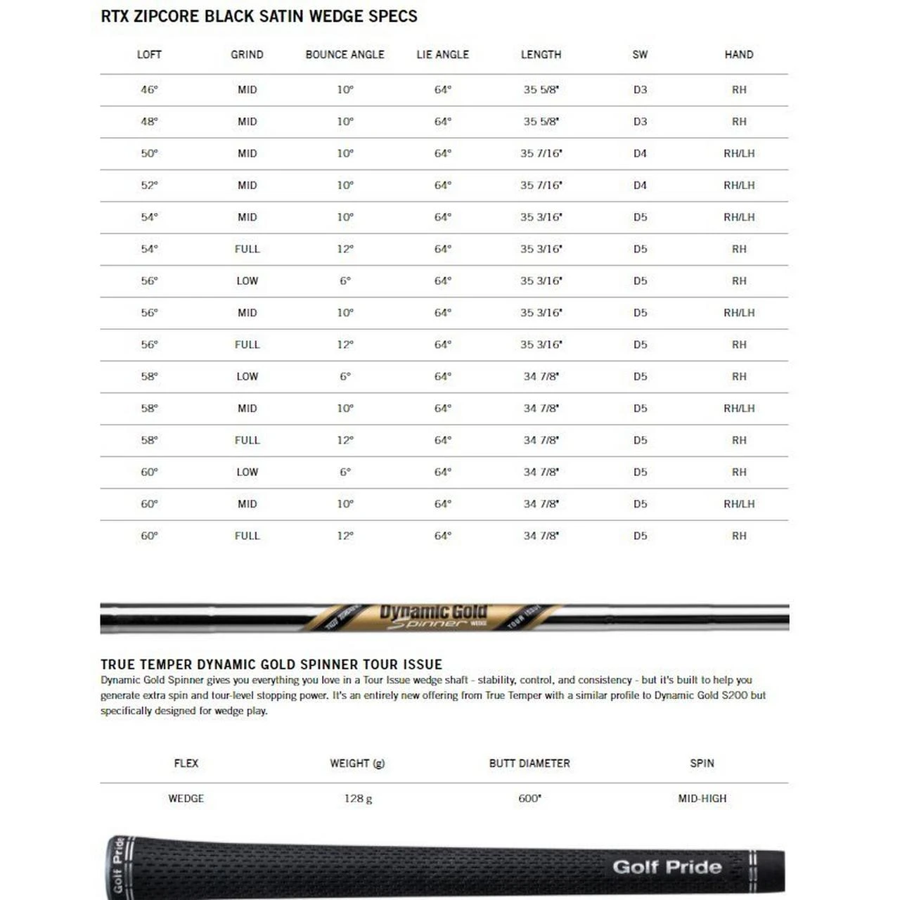 - RTX ZipCore comes standard with the new True Temper Dynamic Gold Spinner Tour Issue shaft and the most popular grip in golf today with Golf Pride’s Tour Velvet 360.