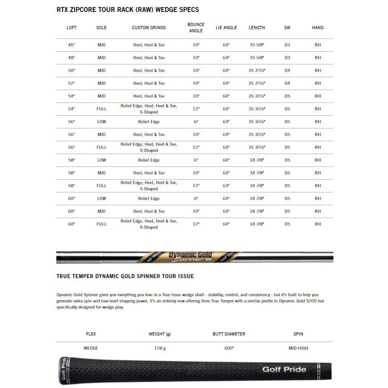 - RTX ZipCore comes standard with the new True Temper Dynamic Gold Spinner Tour Issue shaft and the most popular grip in golf today with Golf Pride’s Tour Velvet 360.